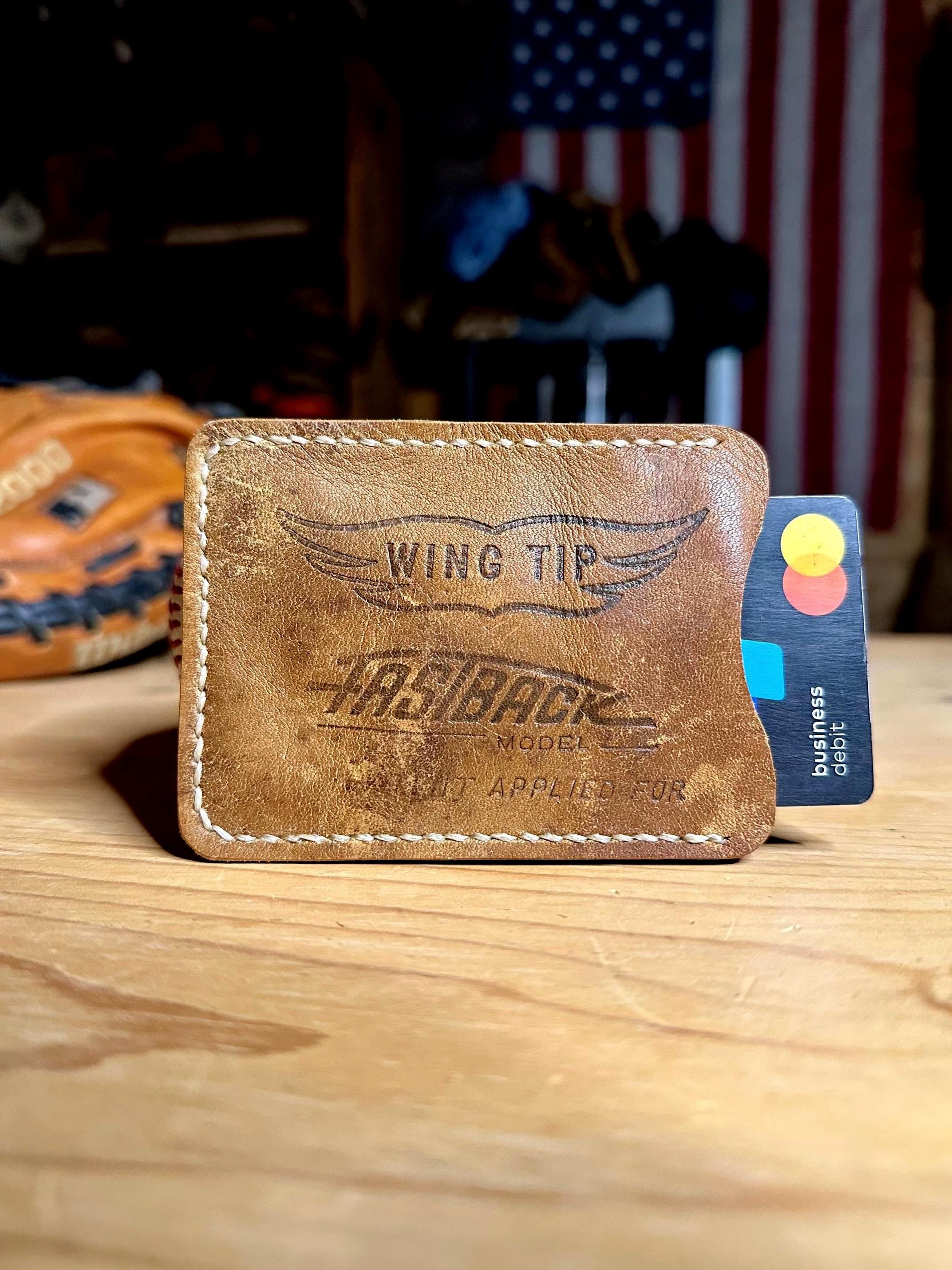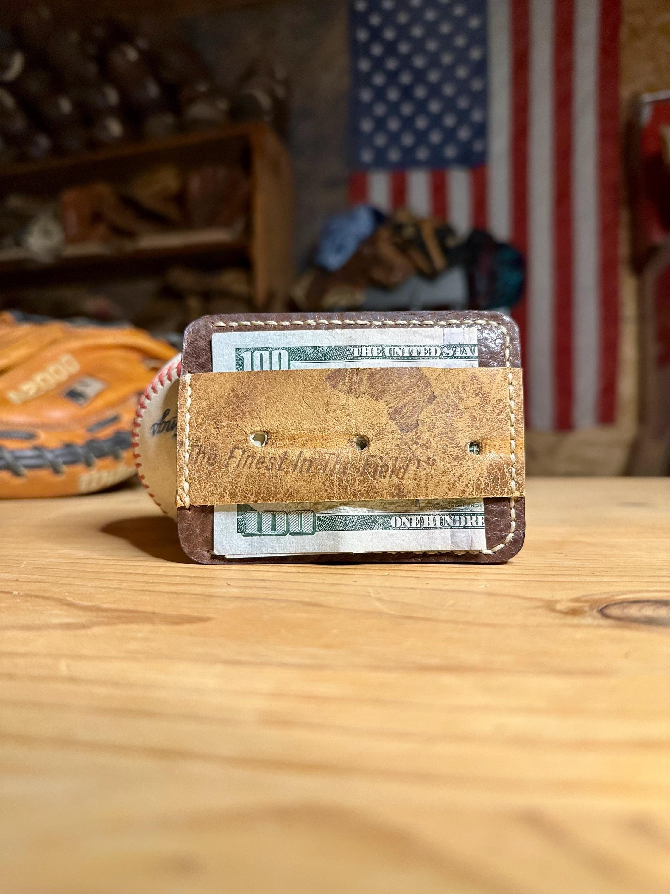 Most of the leather in this wallet is repurposed from a vintage baseball glove and saddle stitched by hand.
