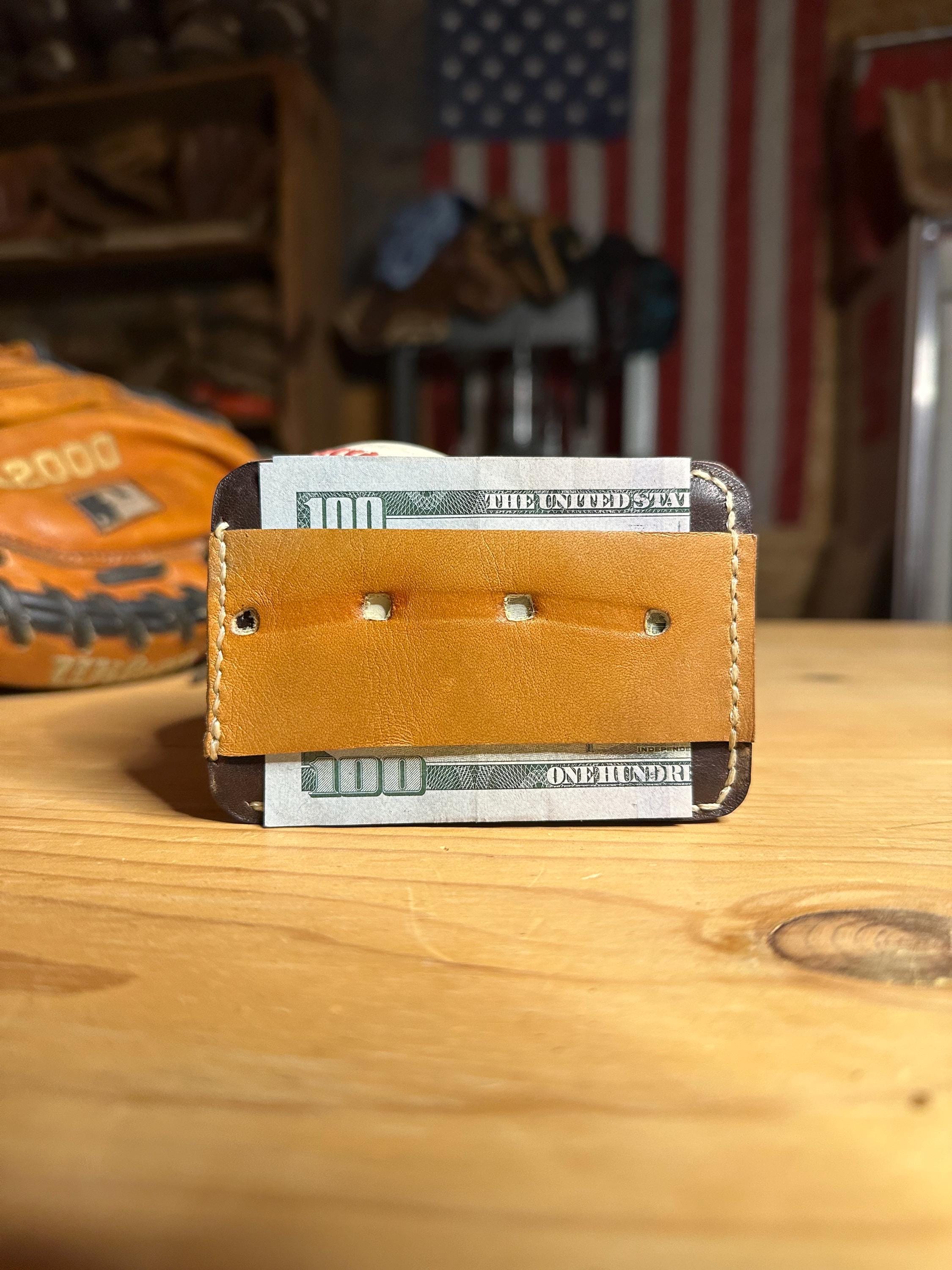 Most of the leather in this wallet is repurposed from a vintage baseball glove and saddle stitched by hand.