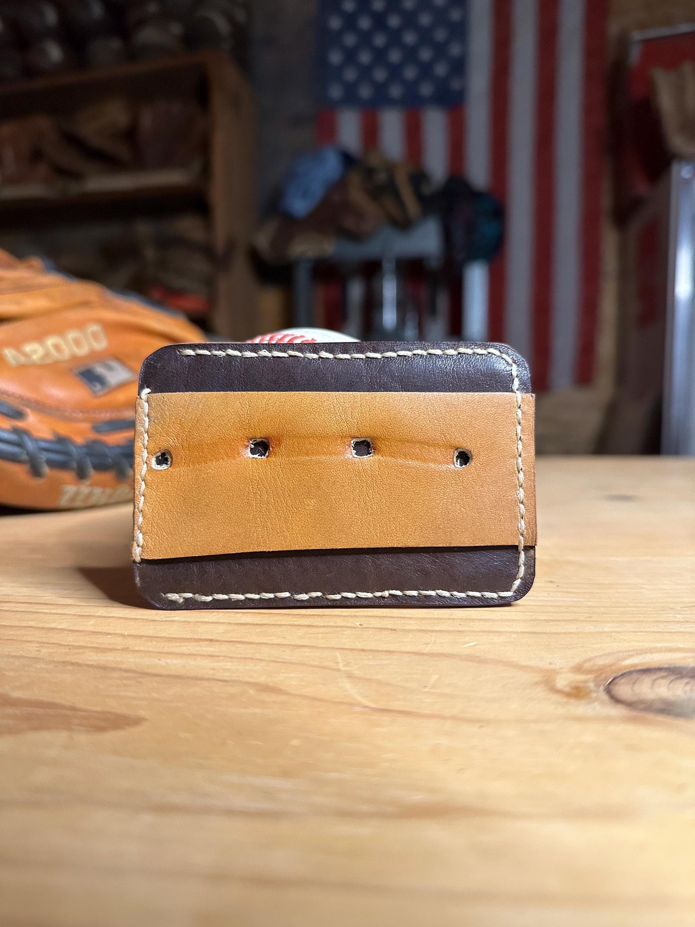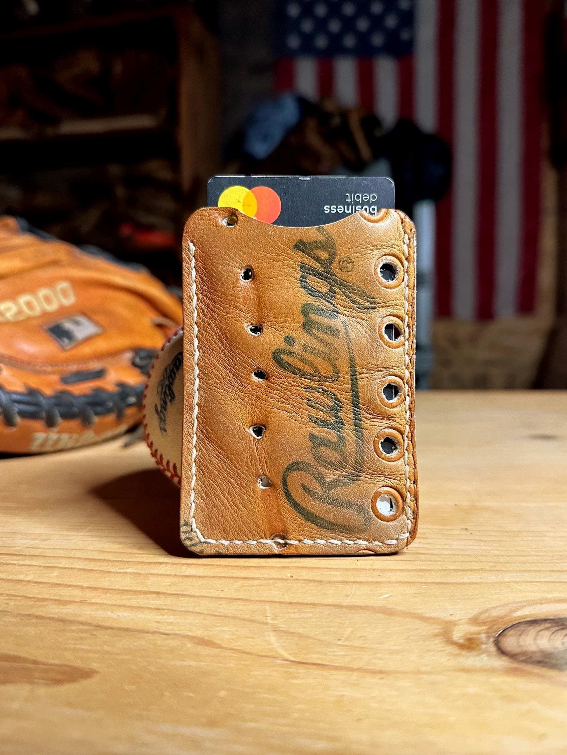 This handmade card holder is crafted from vintage Rawlings baseball glove leather.