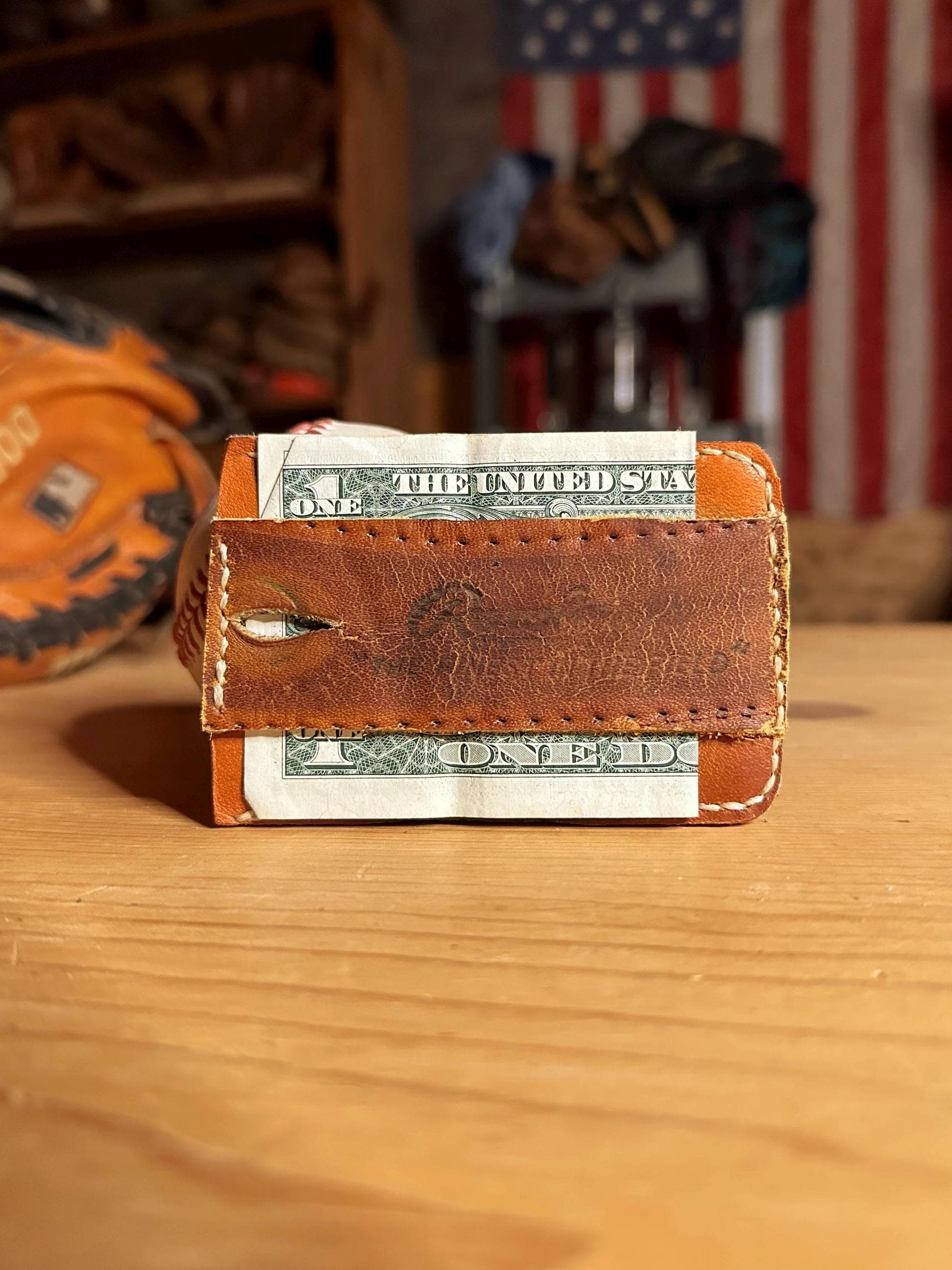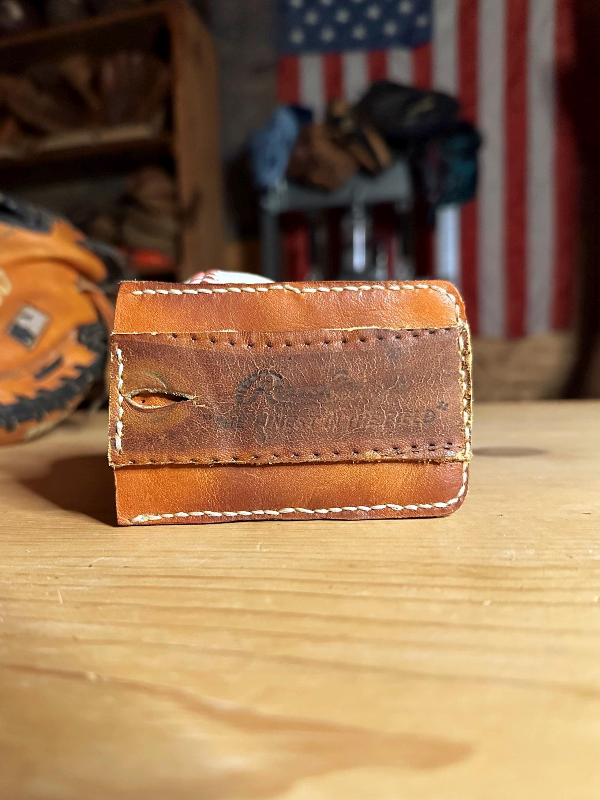Most of the leather in this wallet is repurposed from a vintage baseball glove and saddle stitched by hand.