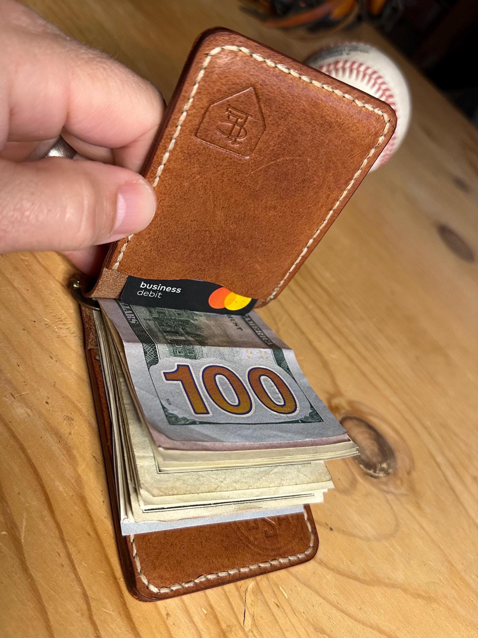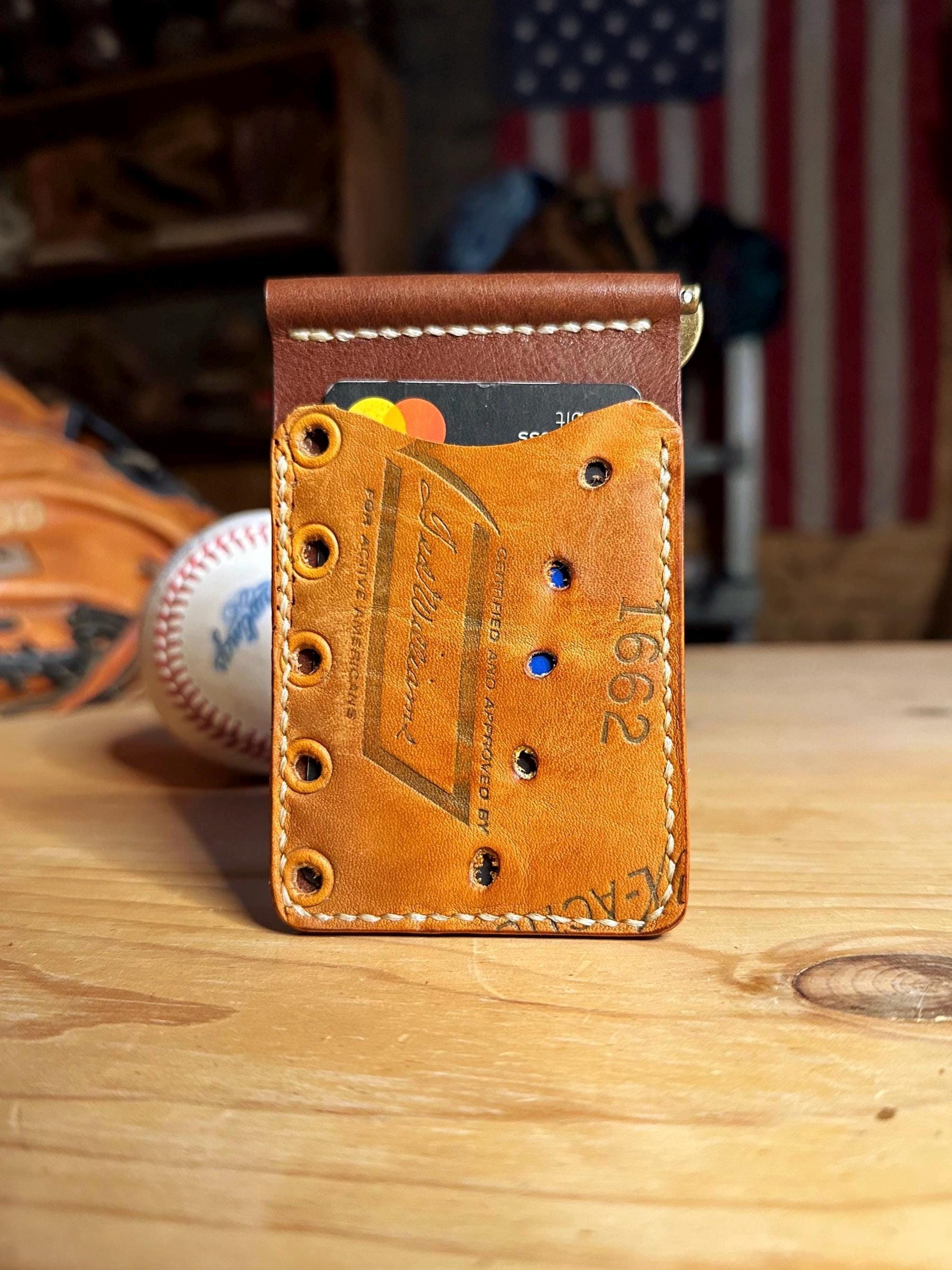This baseball wallet with money clip is made using vintage baseball glove leather from a Ted Williams, a former Boston Red Sox great.