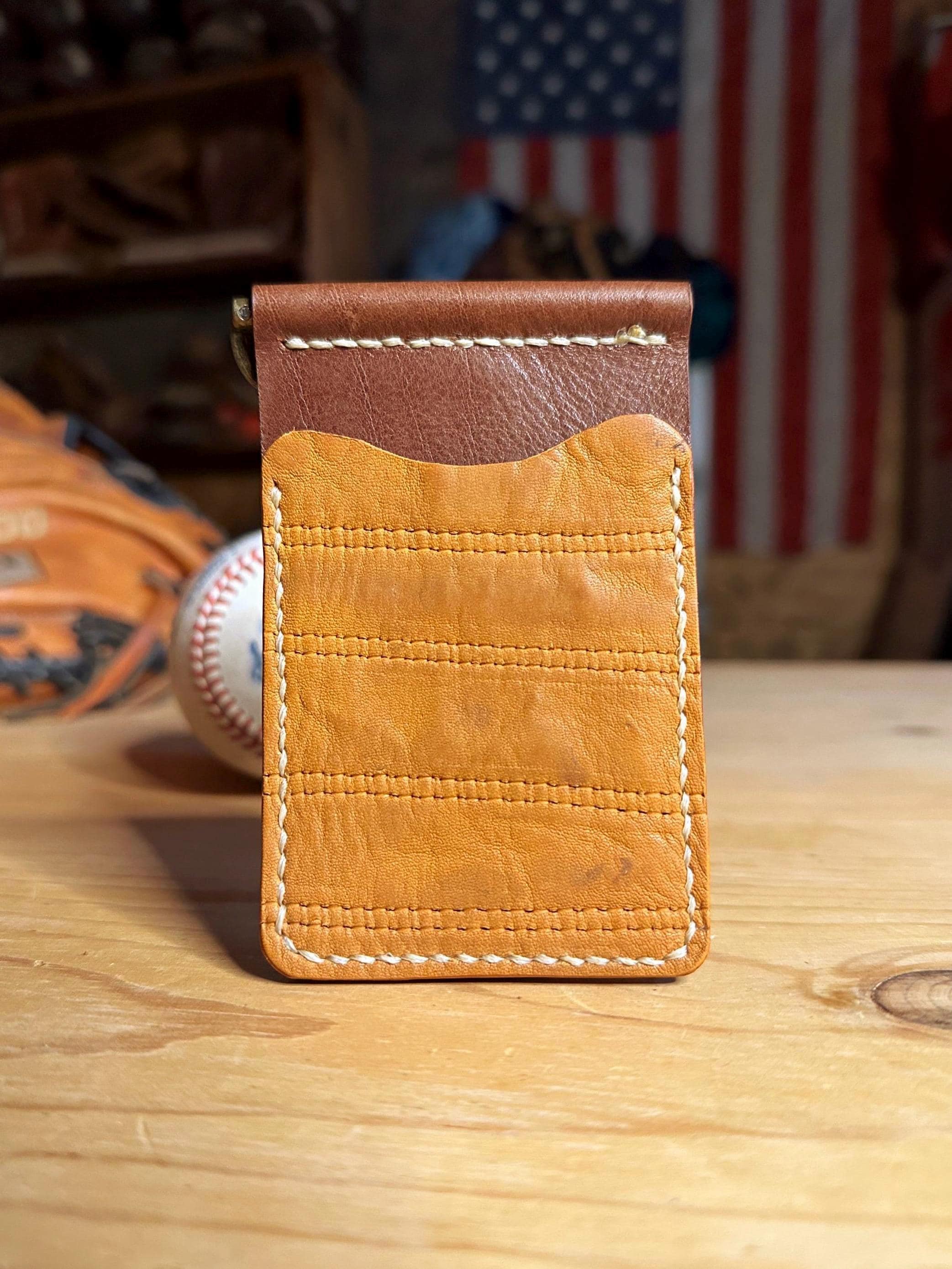 Most of the leather in this wallet is repurposed from a vintage baseball glove and saddle stitched by hand.
