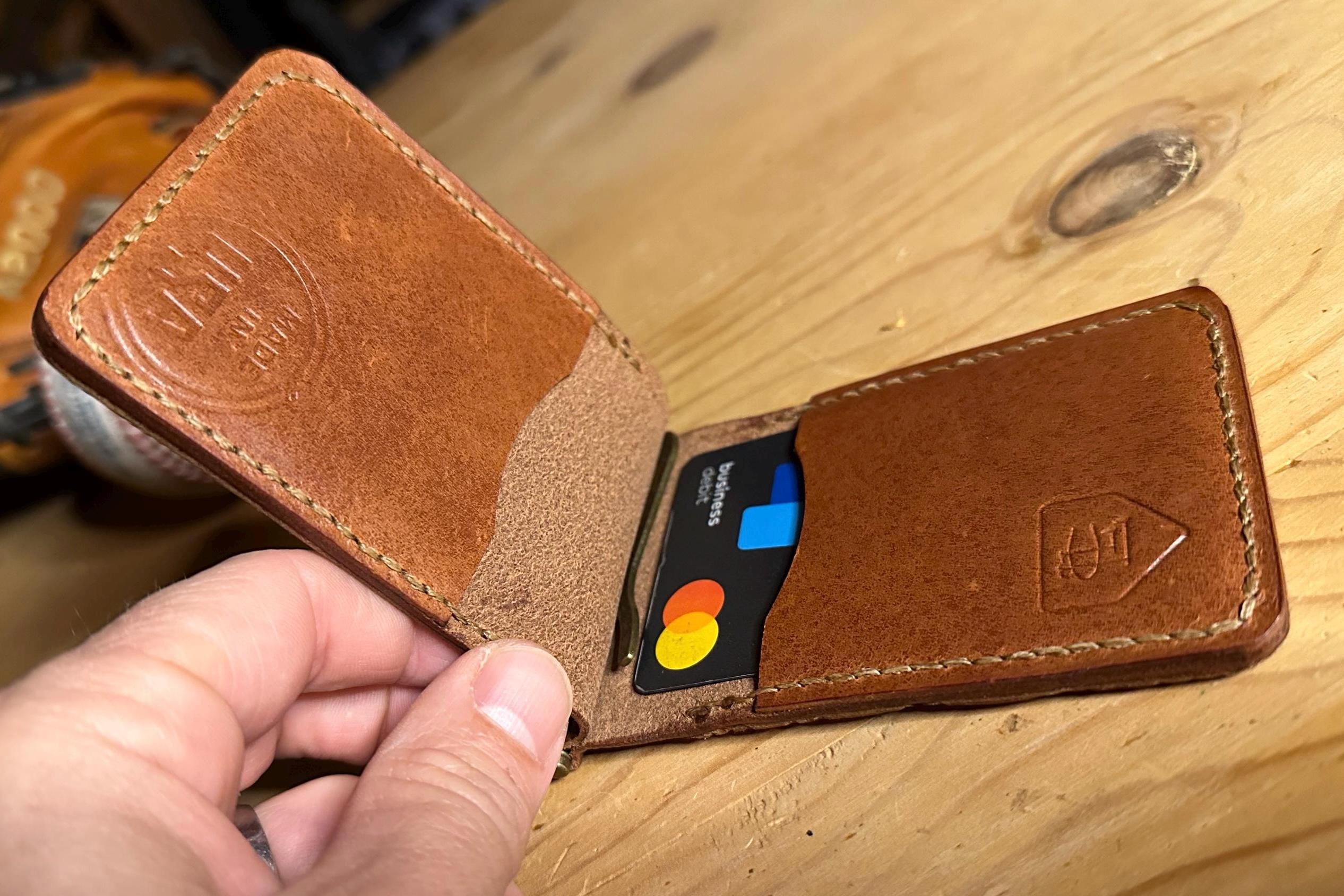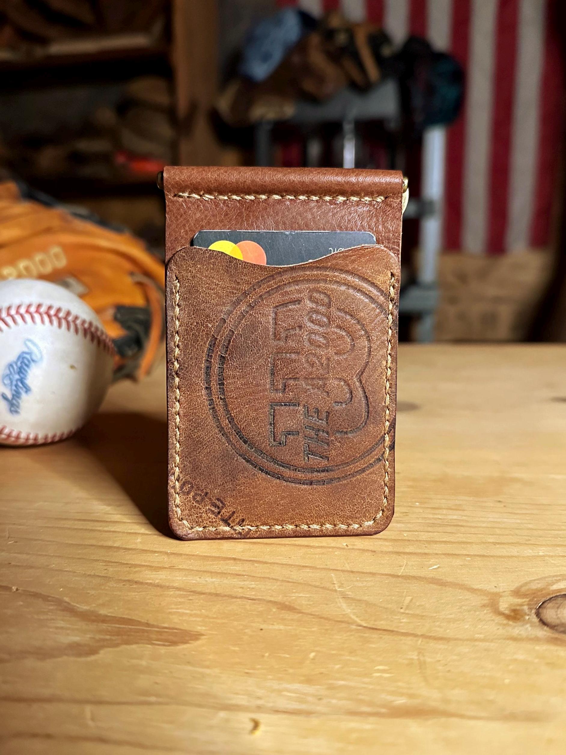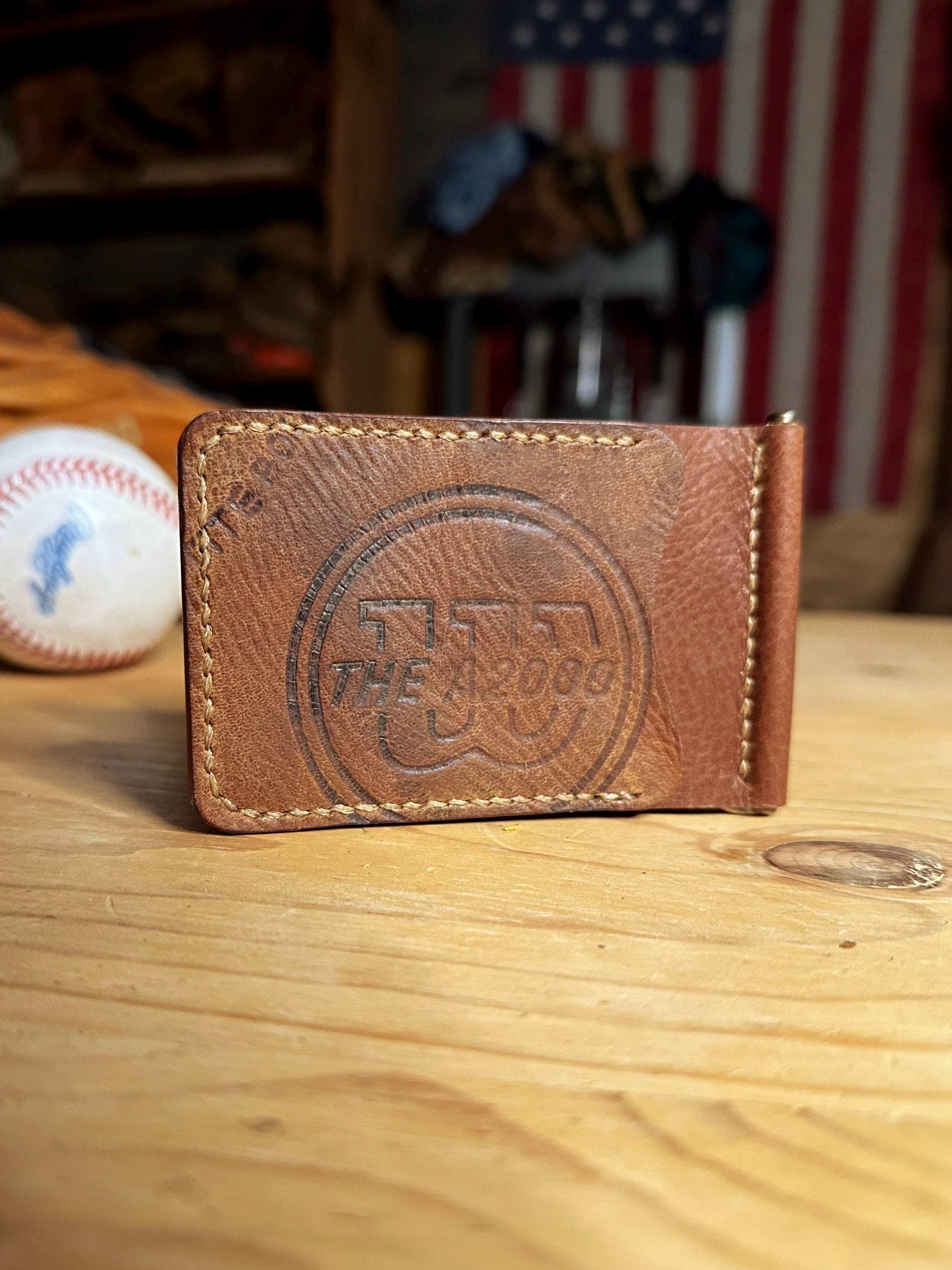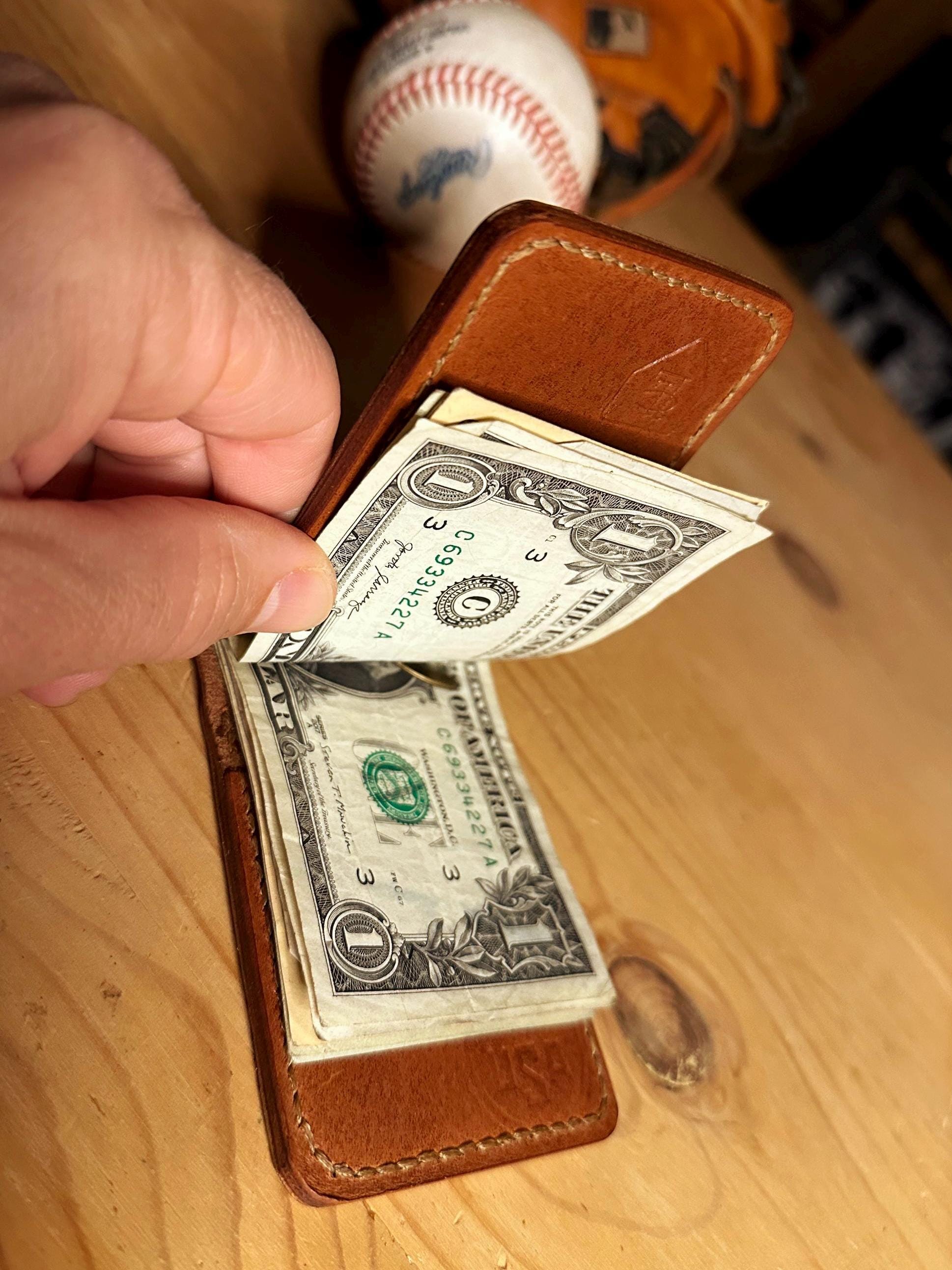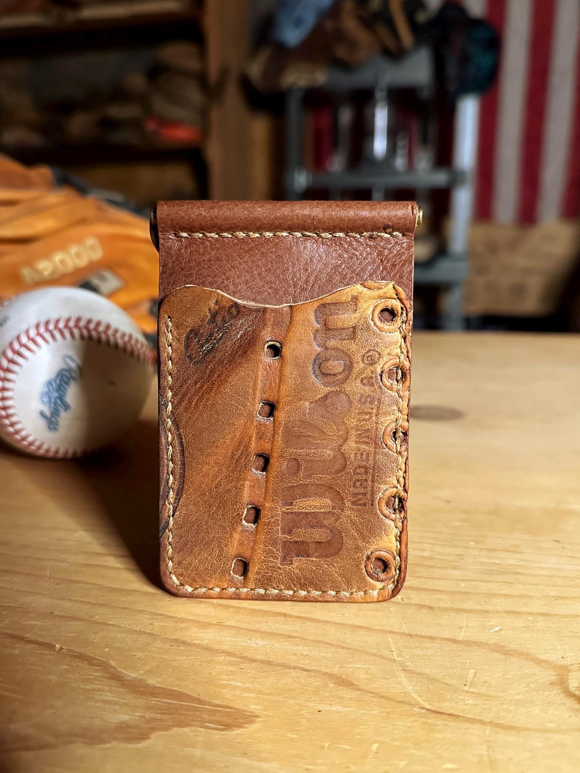 This baseball wallet with money clip is made using vintage baseball glove leather from a Wilson A2000.