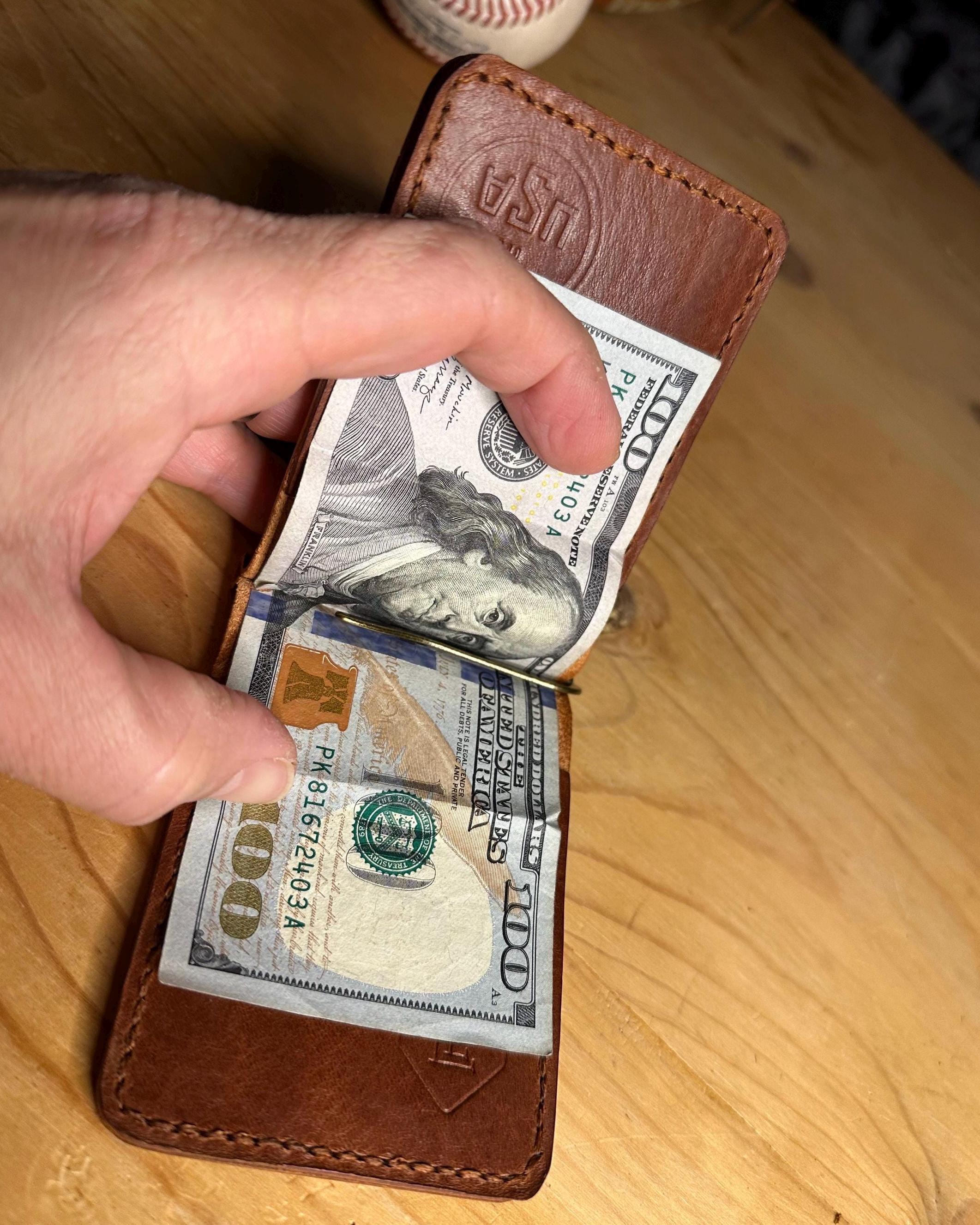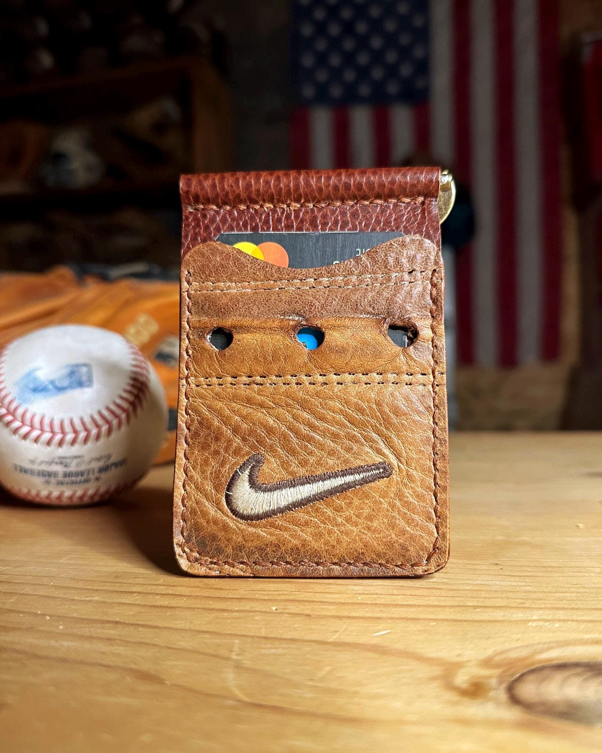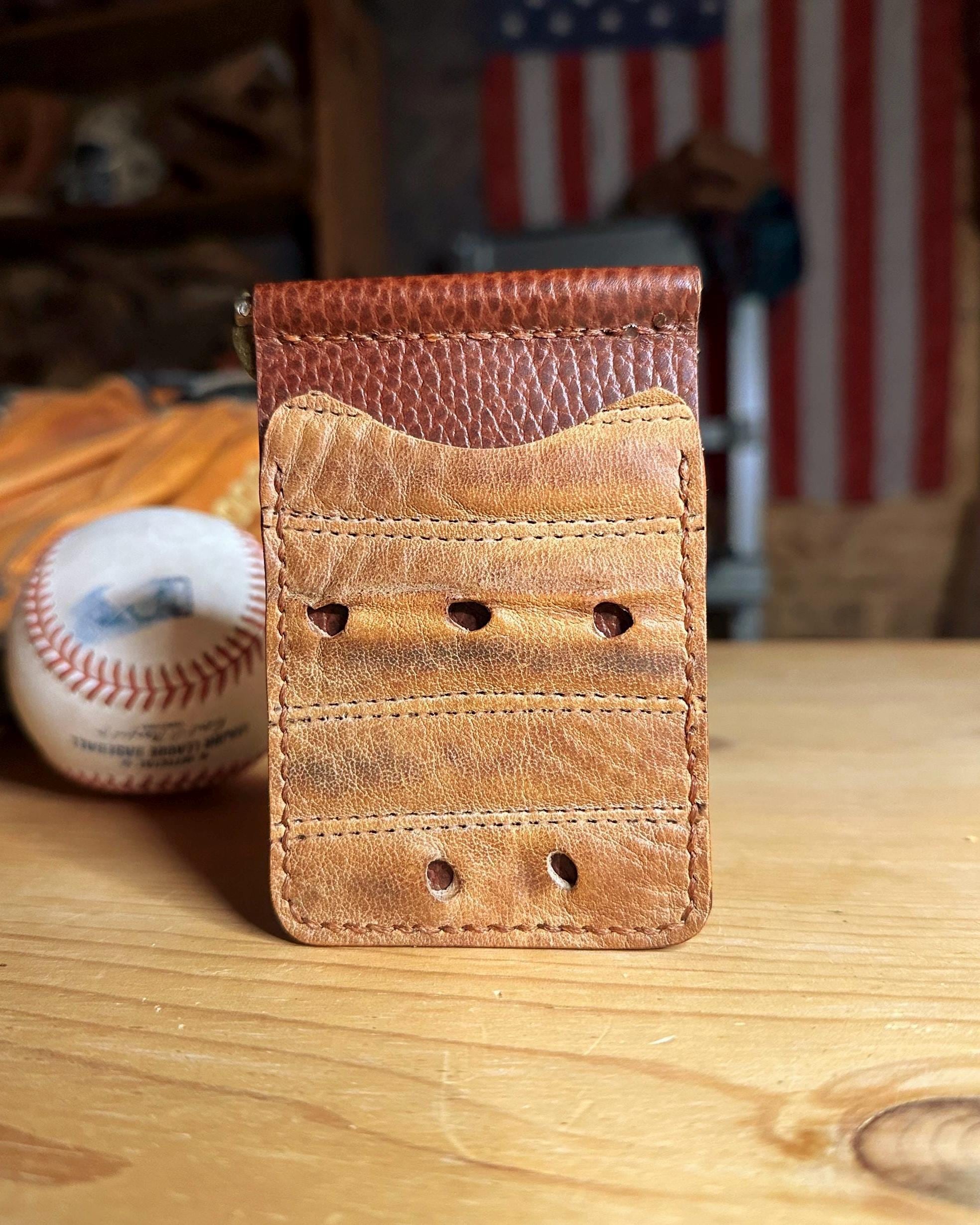 This baseball wallet with money clip is made using vintage baseball glove leather from a vintage baseball glove.