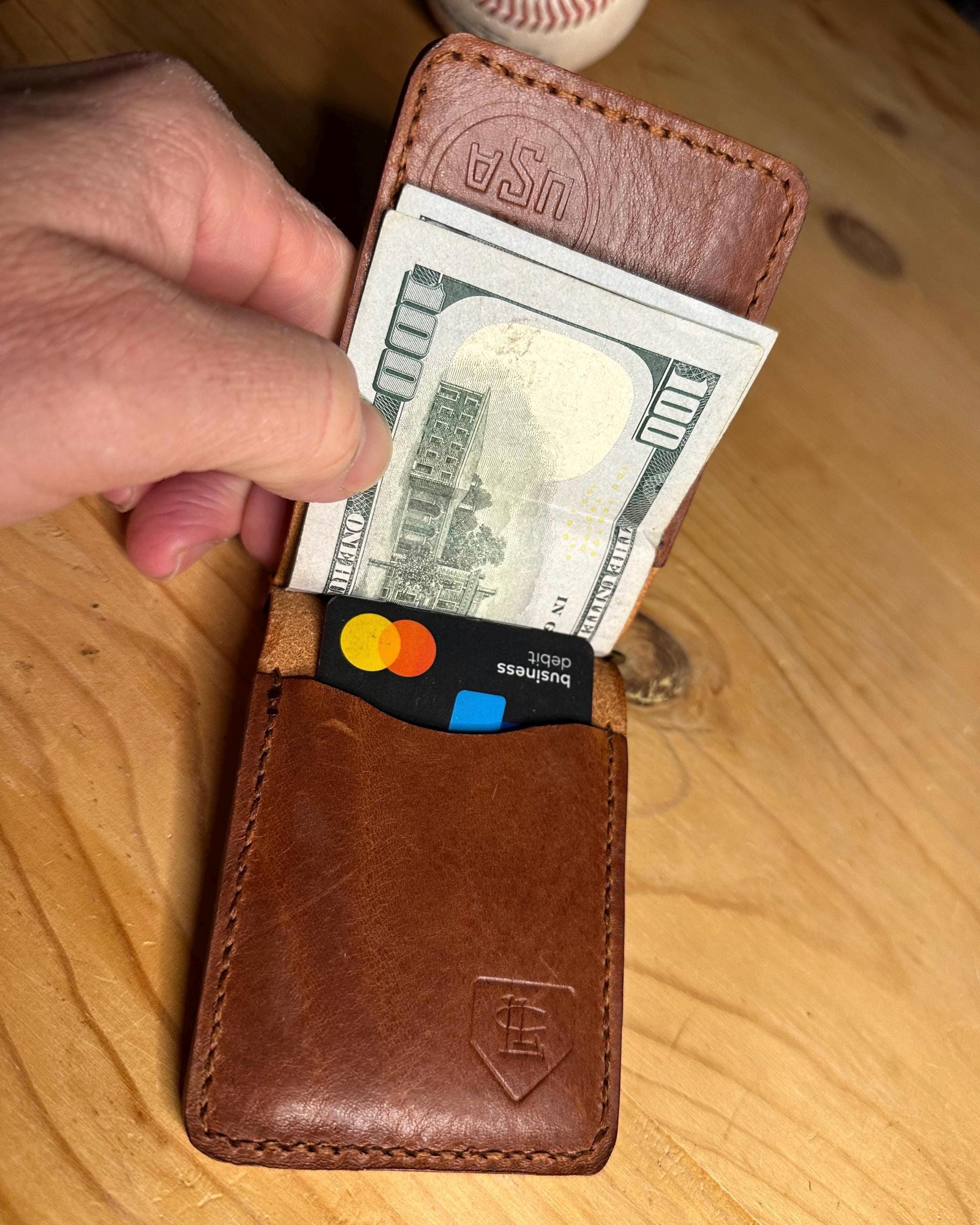 Most of the leather in this wallet is repurposed from a vintage baseball glove and saddle stitched by hand.